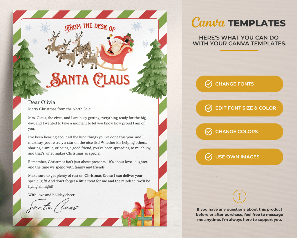 Bring the magic of Santa Claus to life with a fully customizable Canva design. Personalize the letter with your child’s name, favorite activities, and a special message to make this holiday season truly magical. The printable template is easy to edit and perfect for creating a keepsake that your child will cherish forever. 🎄